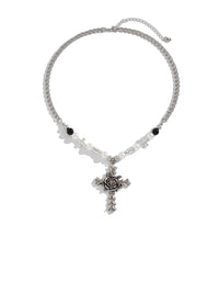 Silver Chain Necklace with Beads & Rose Cross Pendant
