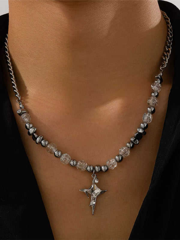 Silver Chain Necklace with Beads & Star Cross Pendant