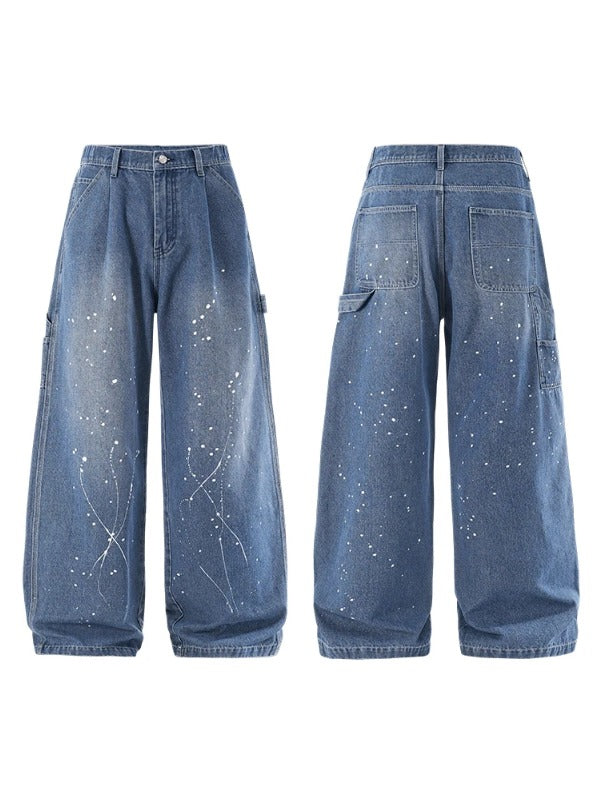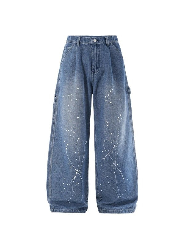 Splash-painted design with randomly arranged textures, exuding an artistic vibe. The hanging loops add visual depth, making it easy to create trendy styles. They can be used to hang small items or pair with accessories, expanding styling possibilities. The loose, straight-leg silhouette flatters all leg shapes and suits various body types. The classic denim fabric is versatile and pairs well with any top. The randomly arranged splash-painted textures highlight unique aesthetic sensibilities. The hanging loop design caters to personalized needs, allowing you to express your personal style and boost confidence in your outfits. distinctiveness.